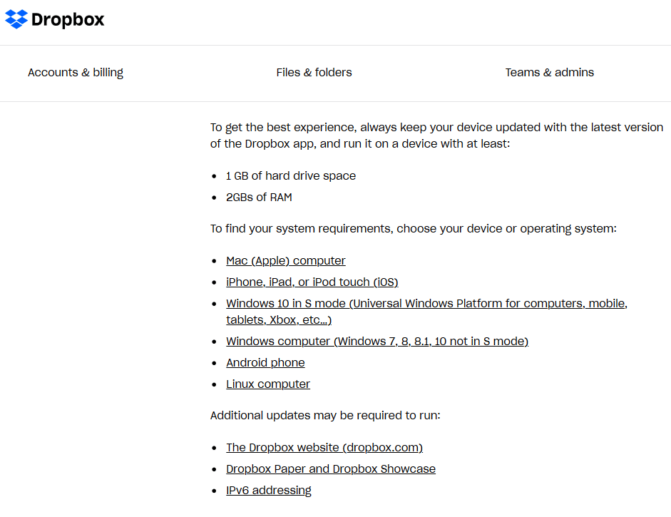 与 Google Drive 相比,Dropbox 与一个额外的平台兼容,包括 Windows (7, S 模式下的 8、8.1、10 和 10)、Mac、iOS、Android、和 Linux。 现在,它也支持像 Xbox One 这样的系统,但它基本上只是一个特殊的 Windows 版本应用程序,所以它没有列在他们的要求中。