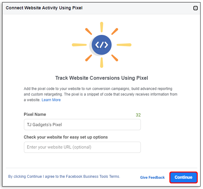 • 选择单击“继续”按钮以同意 Facebook 业务工具条款