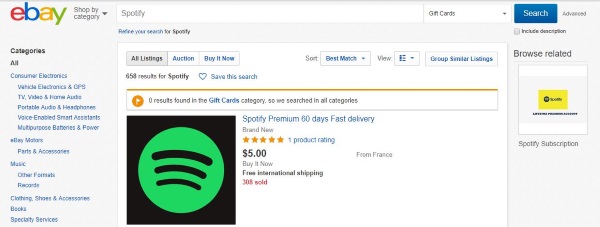 eBay 是 Spotify 礼品卡的良好来源,实际上有数百种不同价格的礼品卡。有数百个卖家都提供礼品卡、高级帐户和各种服务。一年的订阅费用低至 20 美元,而礼品卡的价格范围很广。
