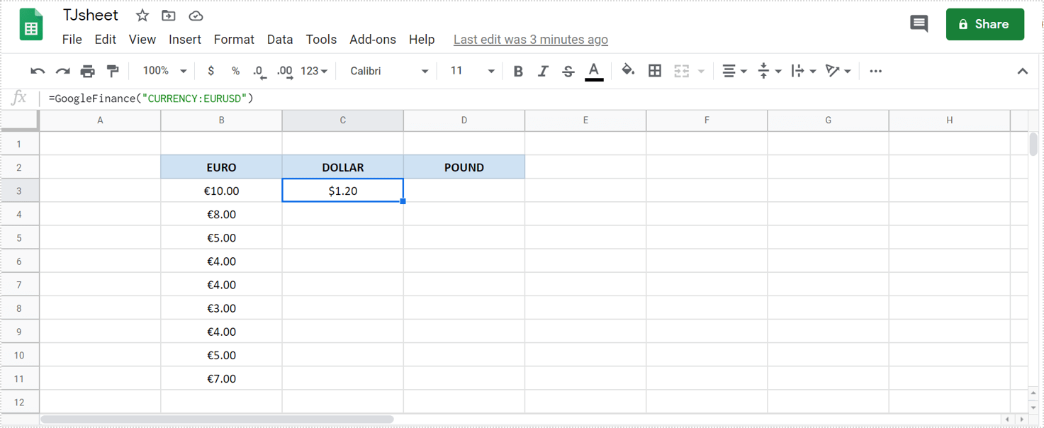 现在,要转换为另一种货币(在本例中为美元和欧元),您将使用“GoogleFinance”公式: