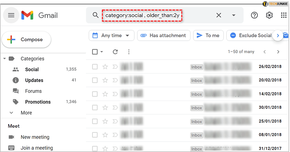现在假设您要删除至少收到的社交电子邮件两年前。为此,您需要在搜索栏中输入组合。在搜索栏中输入 category:social , old_than:2y 。将列出所有电子邮件,您可以从中继续删除它们。