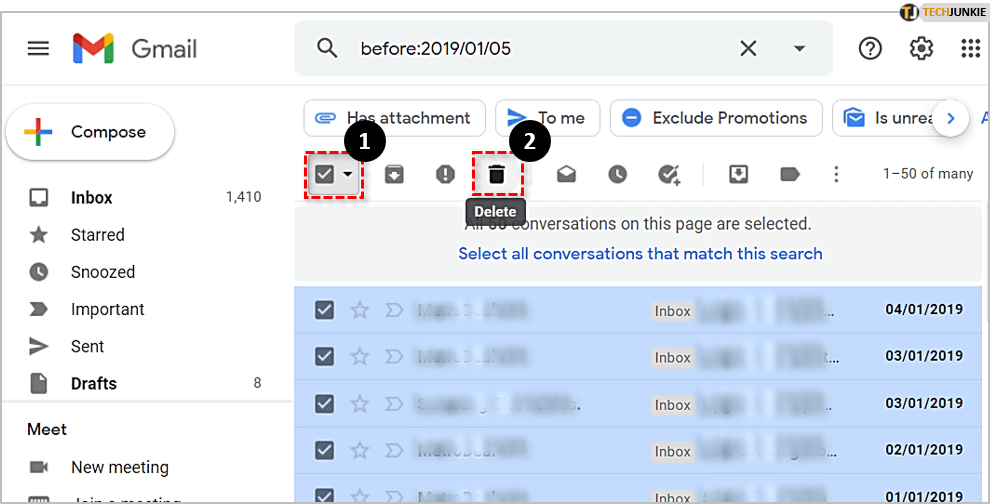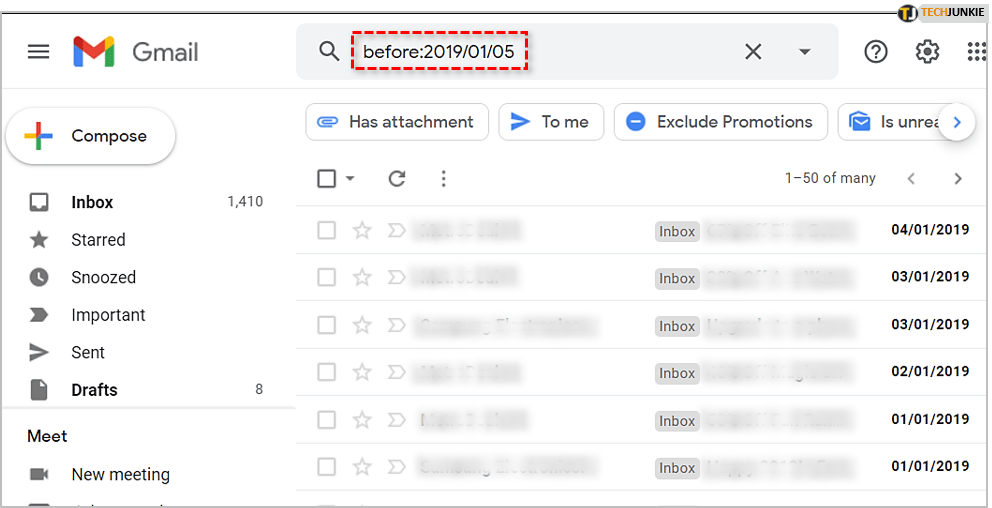 现在假设您只想删除在特定日期之前收到的电子邮件。您需要先在搜索栏中输入特定日期以过滤掉该日期之前的电子邮件。例如,如果您想删除 2019 年 1 月 5 日之前收到的所有电子邮件,则需要在搜索栏中输入 before:2019/01/05