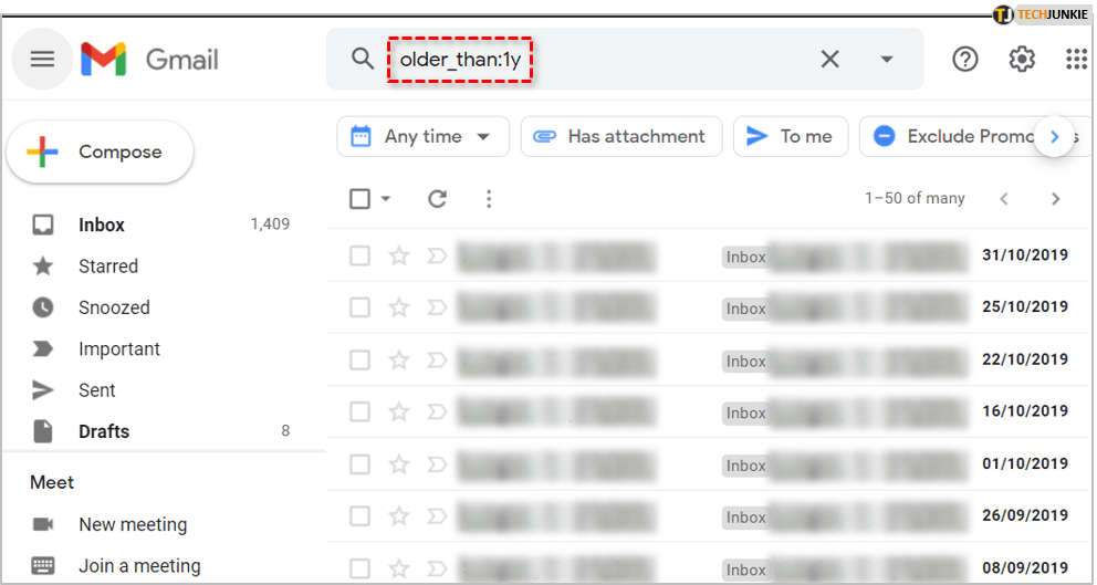 您还可以按电子邮件的年龄来搜索它们。例如,如果您只想查看超过一年的电子邮件列表,则需要在搜索栏中输入 older_than:1y 。您可以按照上述方式删除这些电子邮件。