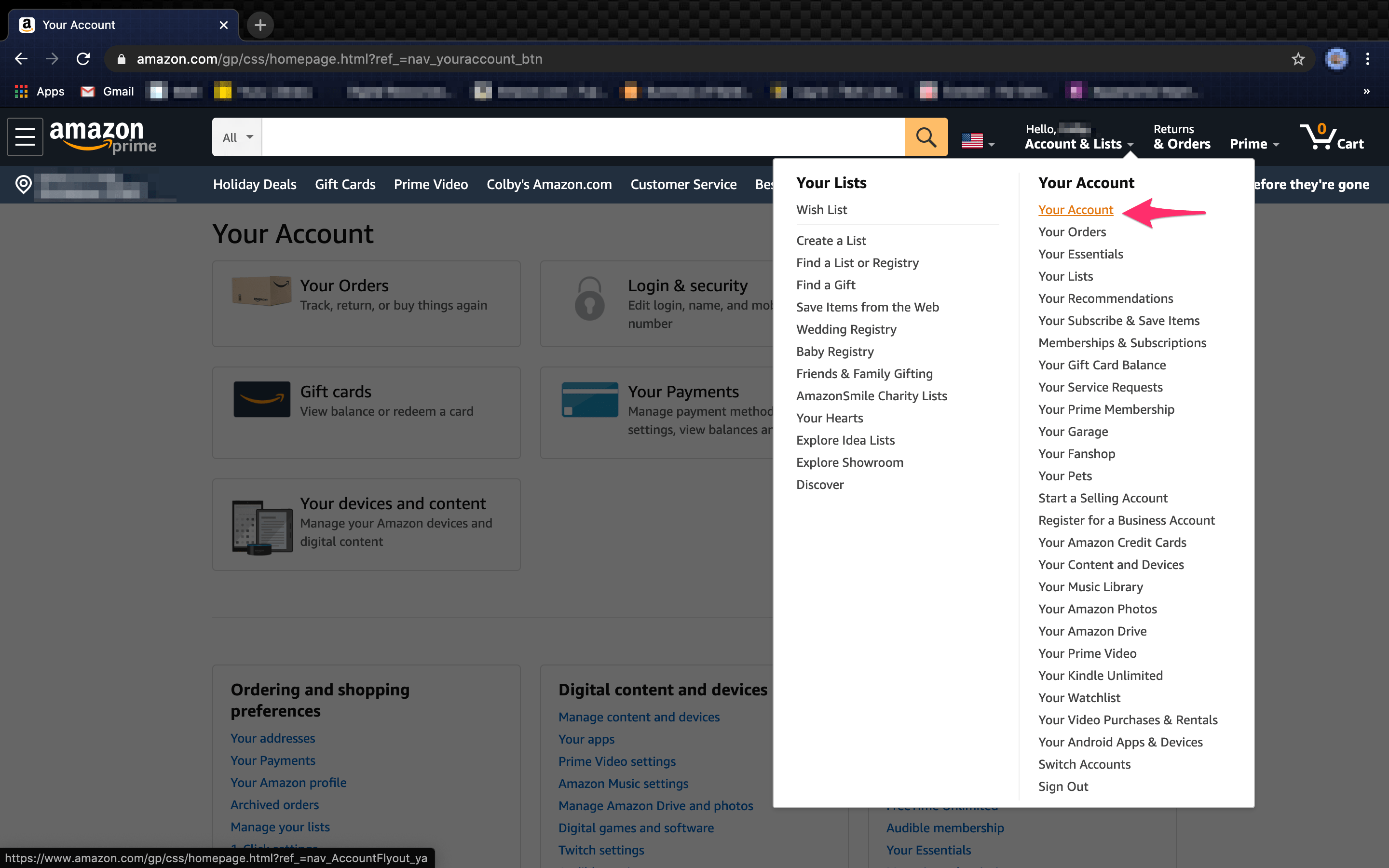 - 使用您当前的凭据登录,将光标悬停在“帐户和放大器”上;列表”下拉菜单。选择您的内容和设备。