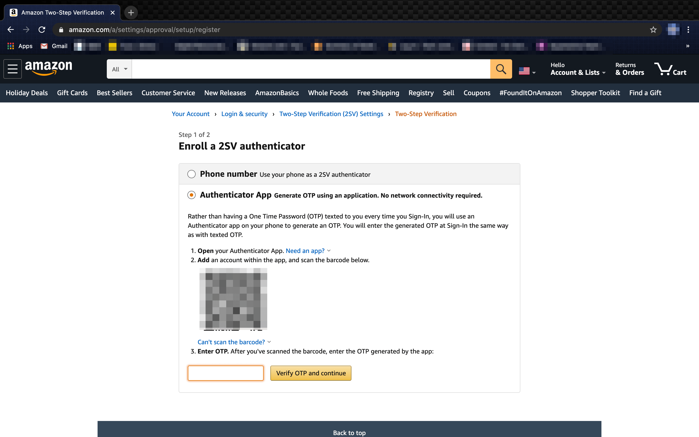 - 扫描后,将在您的身份验证器应用程序上为创建的帐户弹出一个新代码。在亚马逊网站上提供的字段中输入这些数字,然后在代码到期之前点击验证 OTP 并继续。