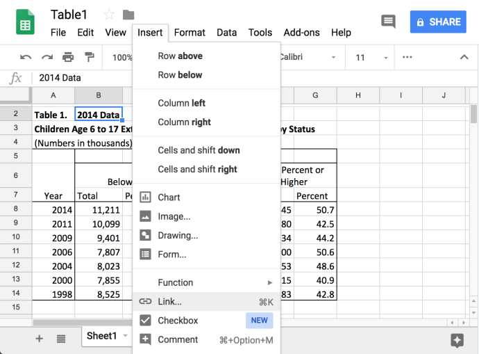 首先,在工作表中选择一个单元格。它可能是一个空单元格或一个已经有数据的单元格。从“插入”菜单中,选择“链接”。在下面的屏幕截图中,我选择顶部包含数据“2014 年数据”的单元格。