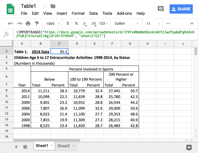 让我们选择工作表的 URL。如果需要,您可以选择另一个工作表的 URL。然后,我们将该 URL 粘贴到我们的 IMPORTRANGE 函数中,然后跟随我们想要抓取的单元格,在我的例子中是单元格 G:21。整个事情看起来像这样: