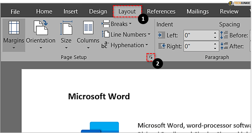 打开 Word 文档并选择页面布局选项卡(在某些版本的 Word 中,它仅命名为布局)。在此选项卡中,您需要单击左下角的小图标以访问“页面设置”窗口。