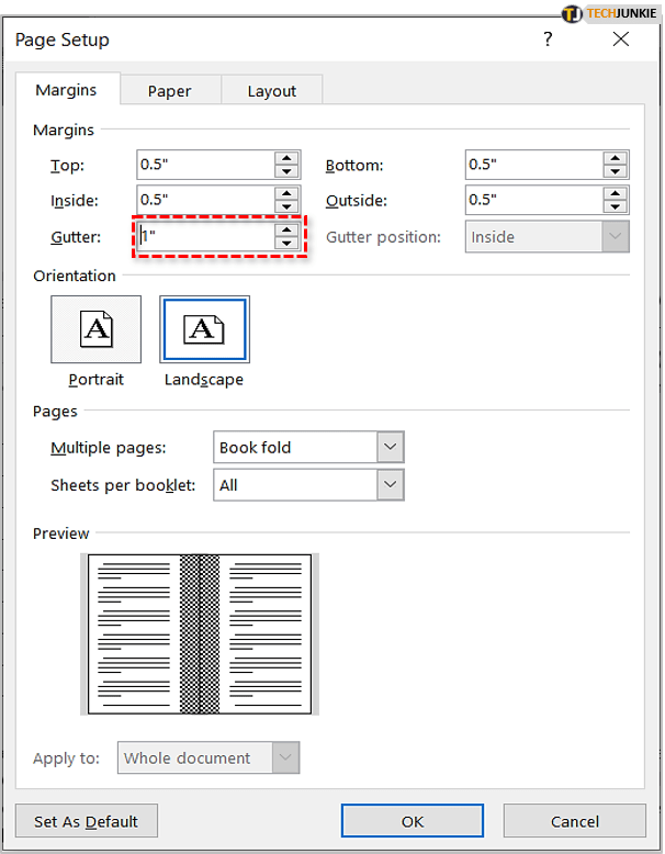 现在,您需要进行 Gutter 调整。装订线是 Word 对出现在页面中间的边距进行配音的方式。默认情况下,这些设置为零,您应该将它们增加到 1。