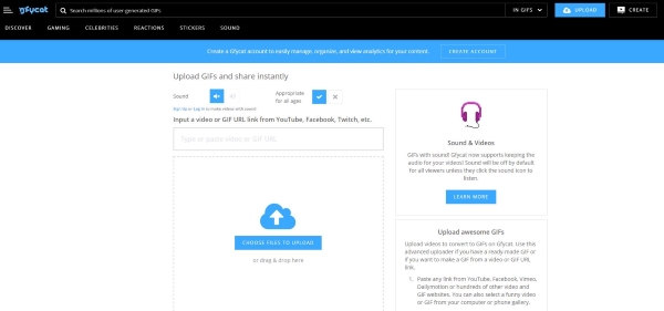 Gfycat 有自己的 GIF 创建者,但我认为使用其他东西然后上传它更容易。您可以使用许多桌面或网络工具,如 Giphy、Biteable 或 Photoshop,并将它们上传到 Gfycat。这样你就有更多的工具和更多的控制你的创作。