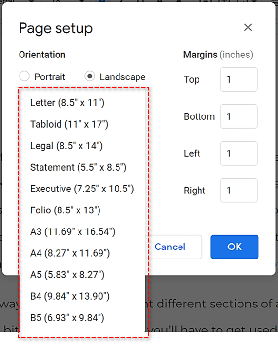 • Google Docs 文档的纸张尺寸支持以下尺寸: