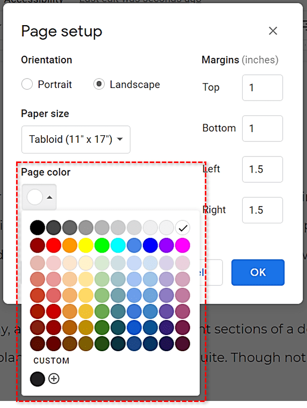 • 更改“页面颜色”会将文档中每个页面的背景更改为所选颜色.因此,如果您希望背景变为黑色以便将文本颜色更改为白色,则可以通过此选项进行操作。还提供自定义颜色。