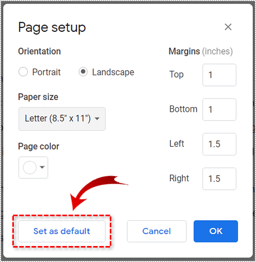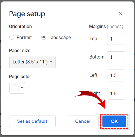 如果您认为横向会比纵向选项更频繁地使用,并且不想每次都经历这些步骤,您可以设置横向作为默认方向。所有需要做的就是点击底部 Set as default 在之前的“页面设置”窗口底部找到点击OK