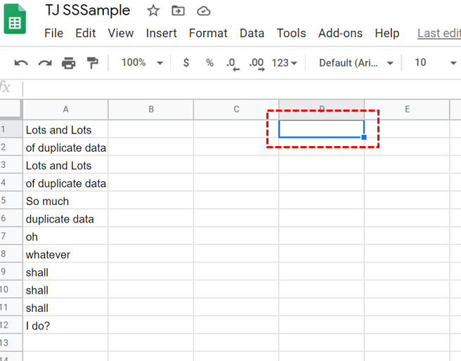 1. 打开要排序的电子表格,然后单击要重复数据删除的数据几行的空单元格。