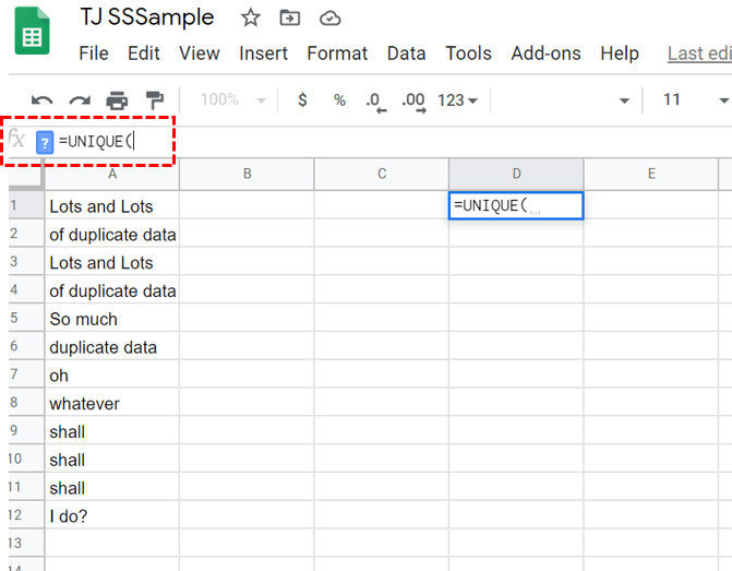 4. 关闭括号以完成公式。在示例图像中,它看起来像 '=UNIQUE(A1:A12)',其中我选择了 A 列的第 1 到 12 行。