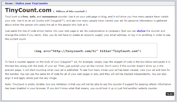 如果您没有网络主机来执行上述操作或 CL 不断删除链接,您可以尝试命中计数器。那里有各种计数器,Simple Hit Counter、Simple Website Hit Counter、Free Craigslist Counter 或 TinyCount。都大同小异。他们将 HTML 代码添加到您的广告中,以计算点击次数。