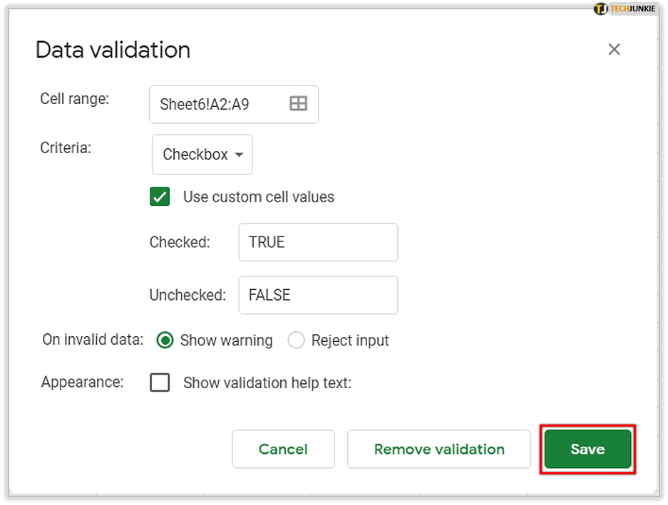 - 选择“使用自定义单元格值”并输入这些值。您可以在“选中”和“未选中”旁边输入值。