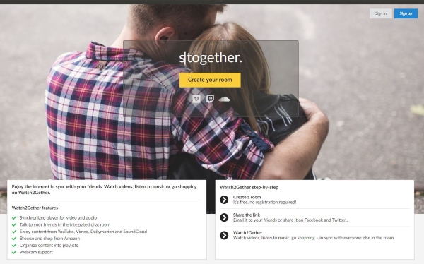 Watch2Gether 是另一个标题很好的应用程序,可让您与朋友一起看电影。它仅限于 YouTube、Vimeo、Dailymotion 和 SoundCloud,但运行良好。您可以创建一个房间,通过 URL 邀请朋友,并随心所欲地观看或收听。作为额外奖励,您也可以在亚马逊上一起购物。