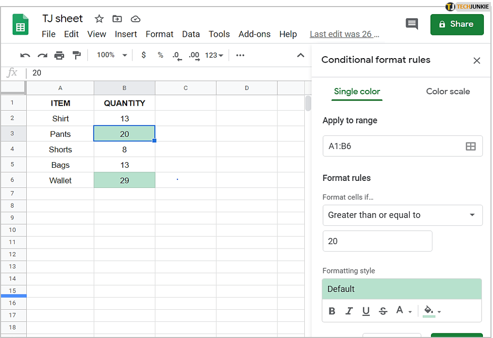 您可能启用了因果公式称为条件格式。此选项可让您根据已设置的公式设置一个或多个单元格的格式。例如,如果一个单元格包含一个大于或等于 20 的值,它就会变成绿色。