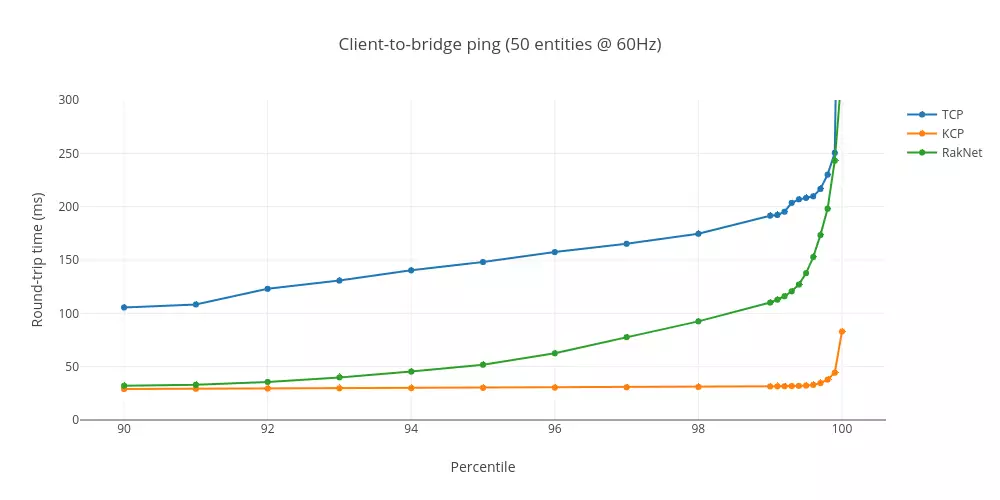 大型多人游戏服务端引擎 SpatialOS 在集成 KCP 协议后做了同 TCP/RakNet 的评测: