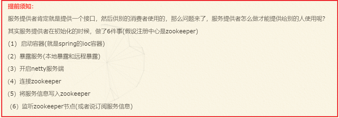 在转成exporter的程序中,会首先去启动netty服务端默认监听20880埠,然后去连接zookeeper注册中心,然后就是使用curator操作zookeeper,根据服务信息创建节点provider,写入服务相关信息,并且创建和监听configurators节点,将其中的资料保存一份到本地磁盘