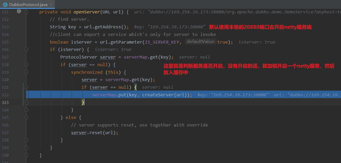下面的createServer(url)方法就是创建netty服务端了,dubbo中默认netty监听埠是20880,所以平常我们如果本地20880埠占用了,那么启动dubbo服务就会失败的!