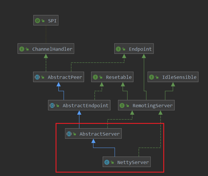 省略中间一点没啥用的步骤,反正就是获取NettyTransporter,呼叫bind方法,然后就是创建nerrtServer实体,NettyServer的继承类图如下所示