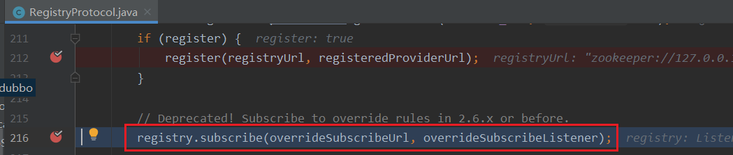 而且根据下图中444行,可以知道dubbo暴露服务是可以支持多个协议的,也就是每一种协议都会暴露一份(我们组态档只配置了dubbo协议)