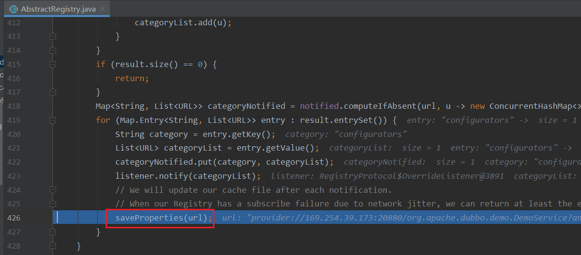 顺便一提: 注意上图中最后一行的notify方法,这里面会做一些特殊的事情,就是会将dubbo中服务提供者信息给保存成档案,本地磁盘保存一份,这样的话,即使注册中心挂了,但是服务也是可以正常使用的