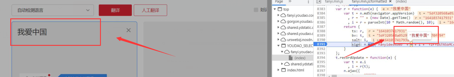 ==e==可以通过设定断点来判断,断点设定好后,再翻译一次,然后把鼠标箭头放在e上,可以很明显的发现e的取值与我们输入的内容相同