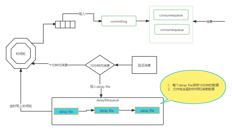 在写入CommitLog之前,如果是延迟讯息,按照每10分钟写入delayfile档案,对于快到时间执行的,直接写入时间轮,并且写入delayfile