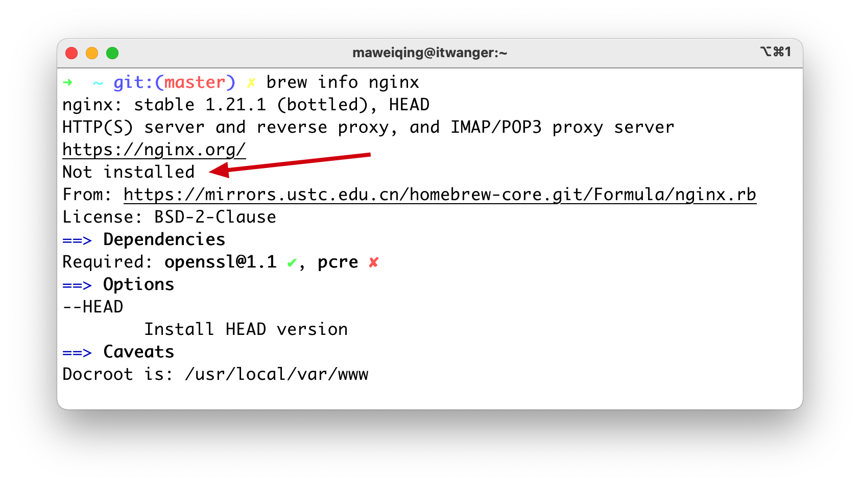 第一步,通过 brew info nginx 命令查看 Nginx 是否安装,