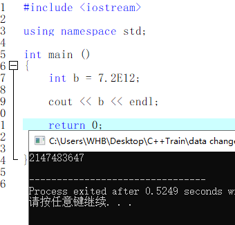 整型变量无法存盘7.2E12,这导致C++没有对结果进行定义的情况发生,在我这种系统中b的值为2147483647,在不同编译器上,值也不一定是这个,