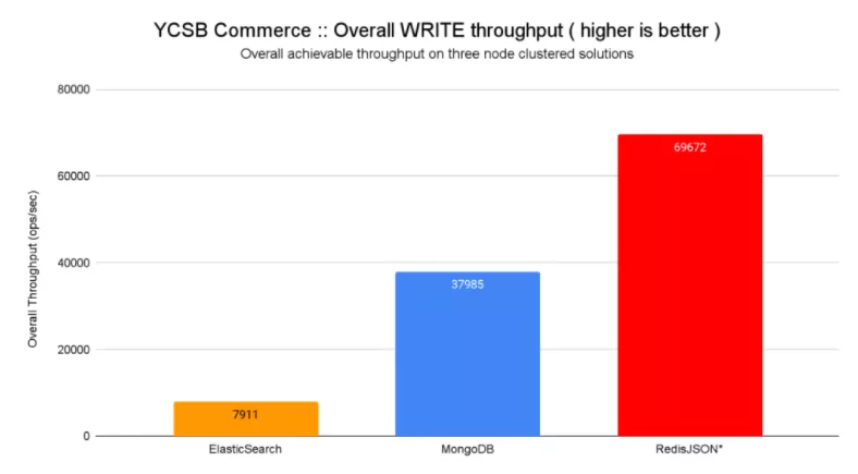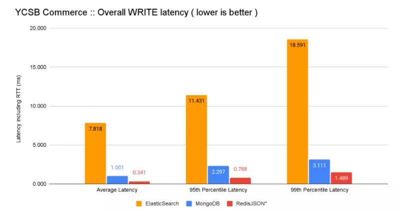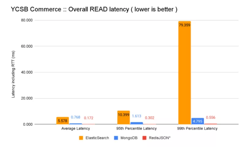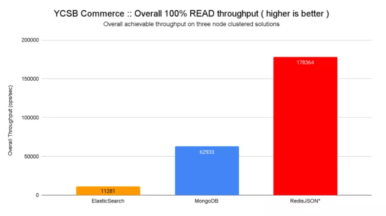 在结合延迟和吞吐量改进时,RedisJSON* 比 MongoDB 快 12.7 倍,比 ElasticSearch 快 500 倍以上,用于隔离读取,