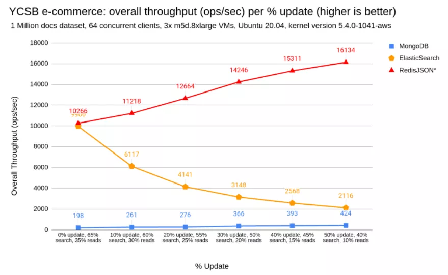 作为起点,我们考虑了 65% 搜索和 35% 读取的场景,这代表了一个常见的现实世界场景,在该场景中,我们执行的搜索/查询比直接读取更多,65% 搜索、35% 读取和 0% 更新的初始组合也导致 ElasticSearch 和 RedisJSON* 的吞吐量相等,尽管如此,YCSB 作业负载允许您指定搜索/读取/更新之间的比率以满足您的要求,