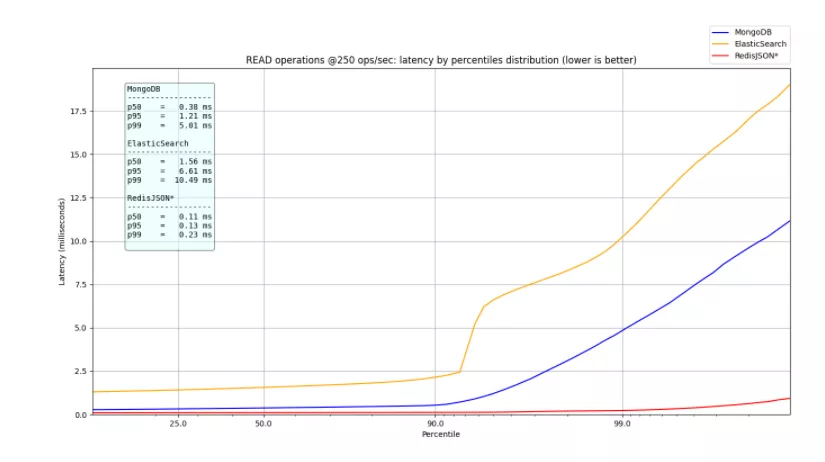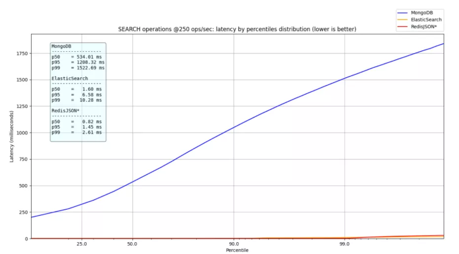 • 250 ops/sec:比较 MongoDB、ElasticSearch 和 RedisJSON*,低于 MongoDB 的压力率,