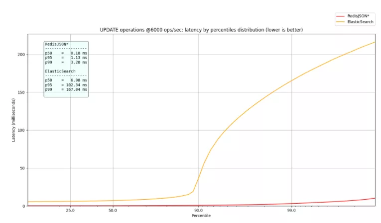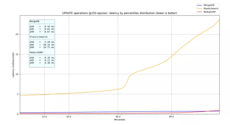 在更新时,RedisJSON* 保留了 3 毫秒的 p99,而 ElasticSearch 则保留了 167 毫秒的 p99,