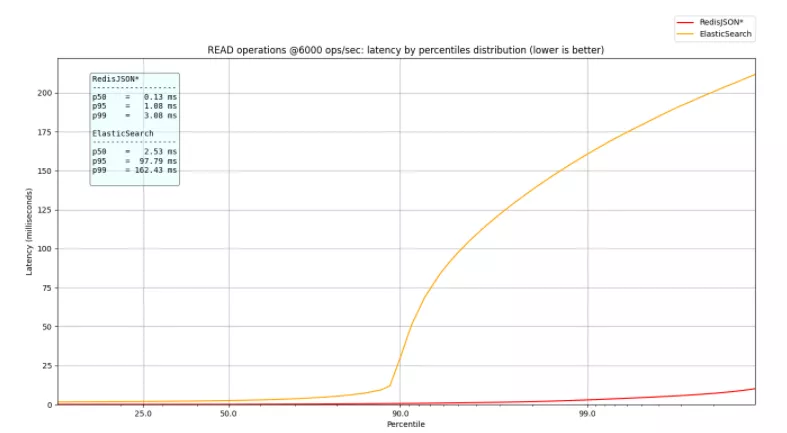 • 6000 ops/sec:比较 ElasticSearch 和 RedisJSON*,低于 ElasticSearch 压力率,
