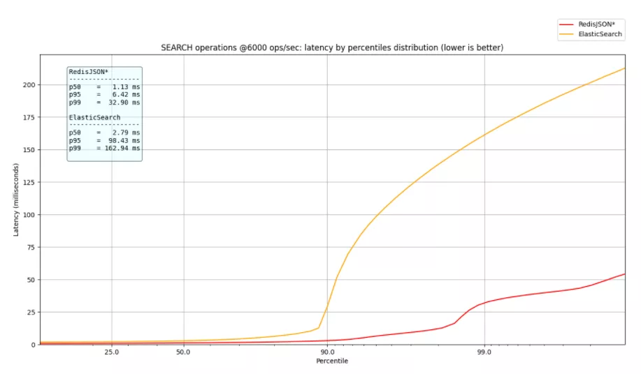 RedisJSON* 将 p99 保持在 33 毫秒以下,而 ElasticSearch 上的 p99 百分位数为 163 毫秒,高出 5 倍,