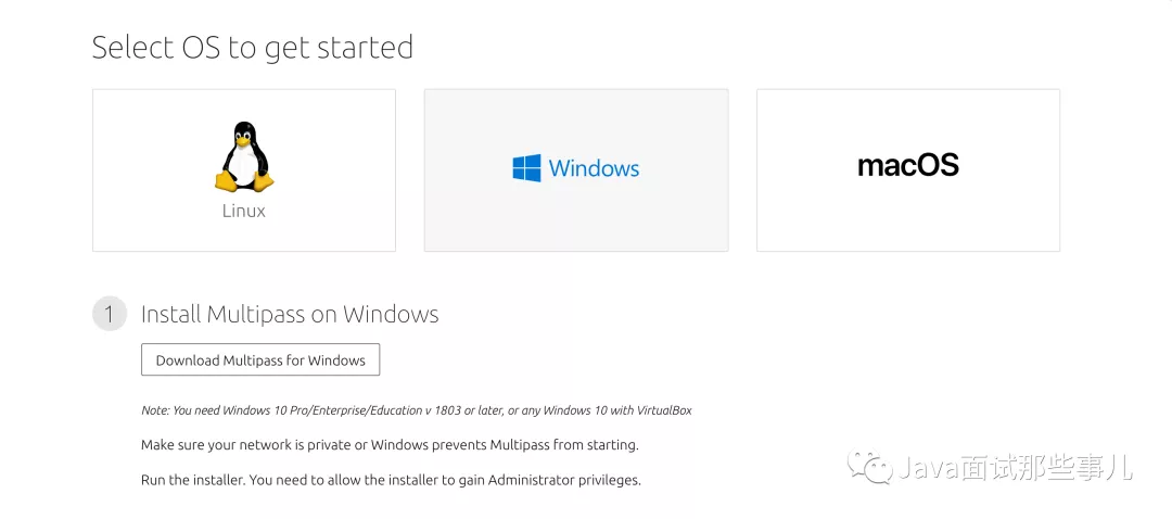首先我们需要在官网下载并且安装 Multipass ,选择自己对应的作业系统,我选择的是 Windows ,