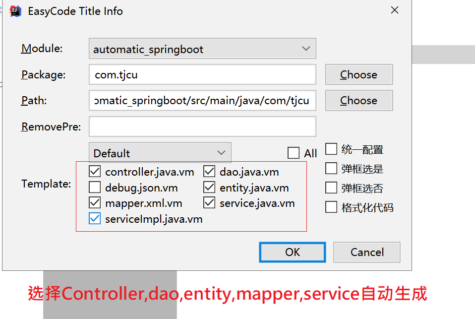 • 选择entity(物体类层)、controller(控制层)、service(业务层)、dao(dao层)、mapper(mapper档案)