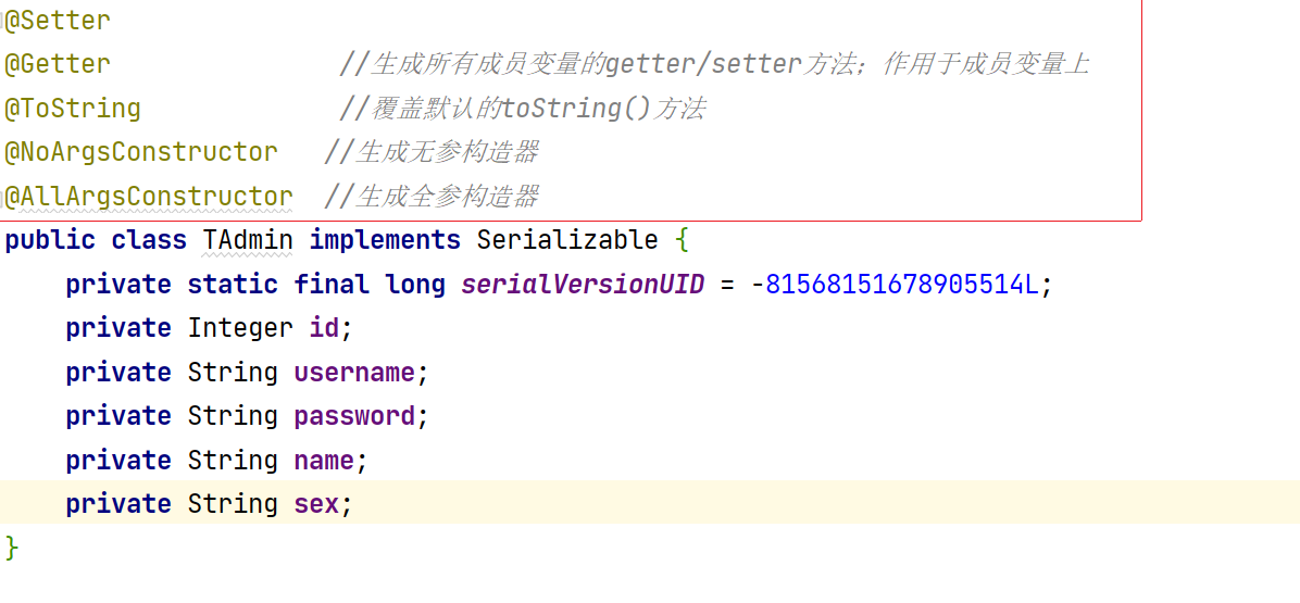 @Getter               //生成所有成员变量的getter/setter方法;作用于成员变量上