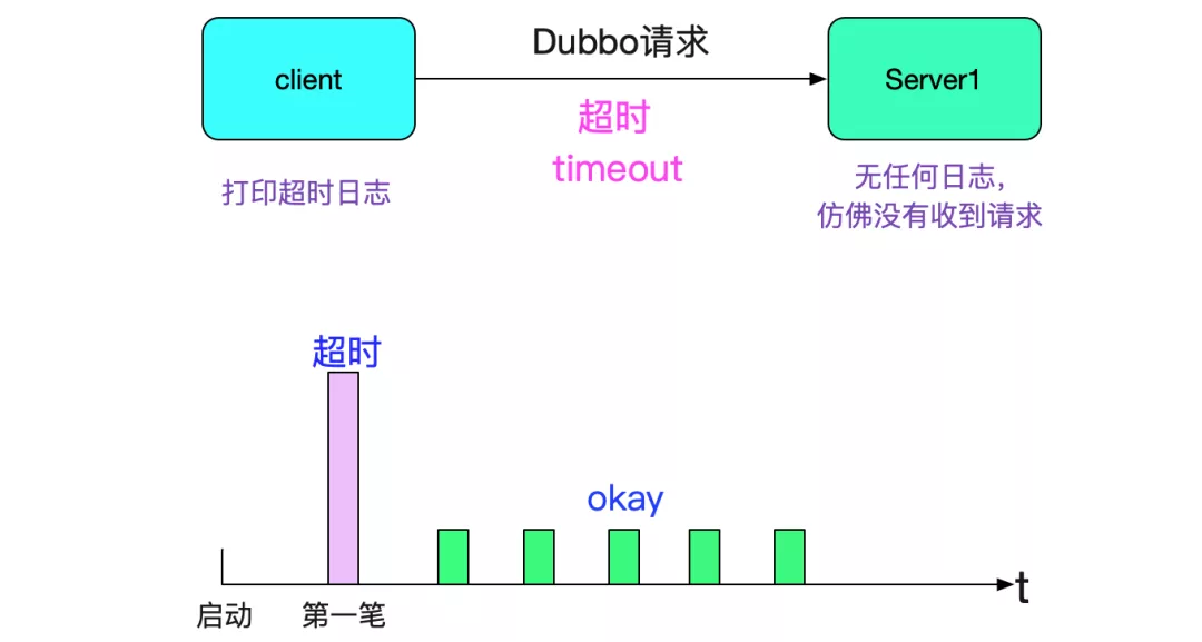 我们采用的是dubbo服务,这是个稳定成熟的RPC框架,但是我们在某些应用中会发现,只要这个应用一发布(或者重启),就会出现请求超时的问题,如下图所示: