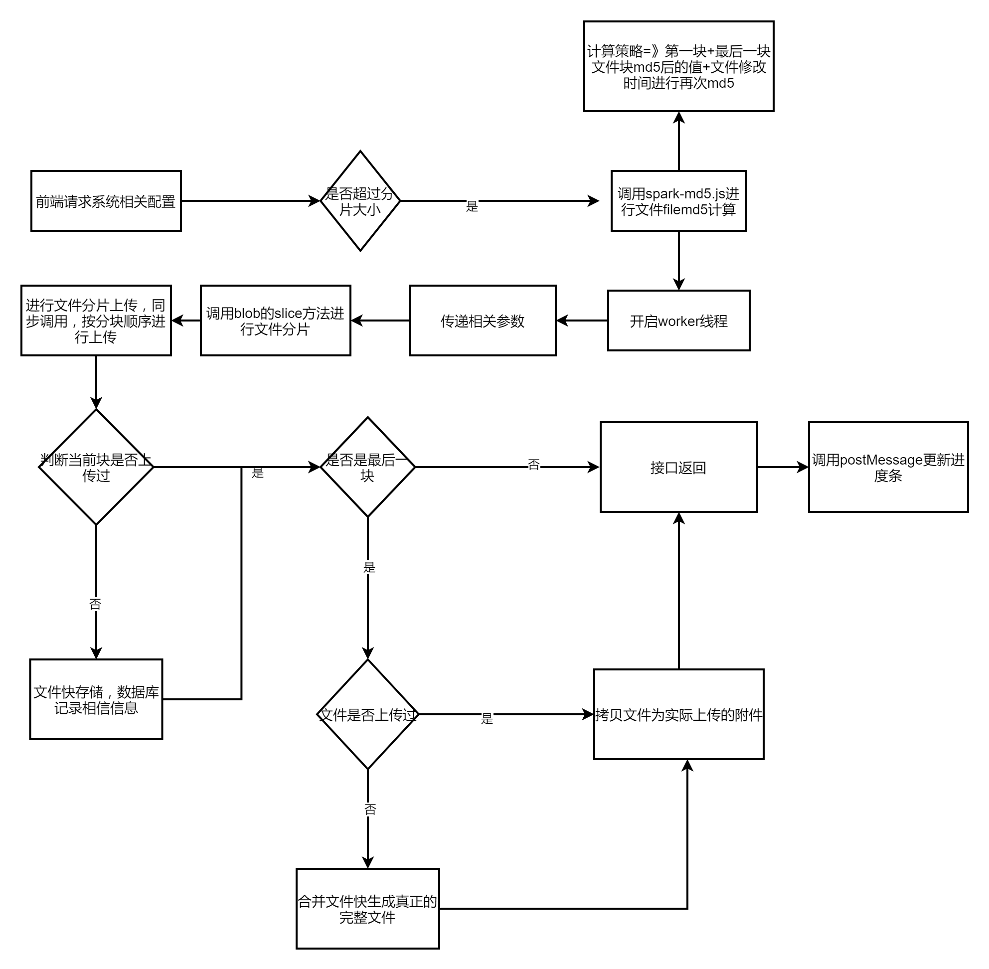 对于档案md5的计算我们使用spark-md5第三方库,大档案我们可以分片分别计算再合并节省时间,但是经测验1G档案计算MD5需要20s左右的时间,所以经过优化我们抽取档案部分特征信息(档案第一片+档案最后一片+档案修改时间),来保证档案的相对唯一性,只需要2s左右,大大提高前端计算效率,对于前端档案内容块的读取我们需要使用html5的api中fileReader.readAsArrayBuffer方法,因为是异步触发,封装的方法提供一个回呼函式进行使用