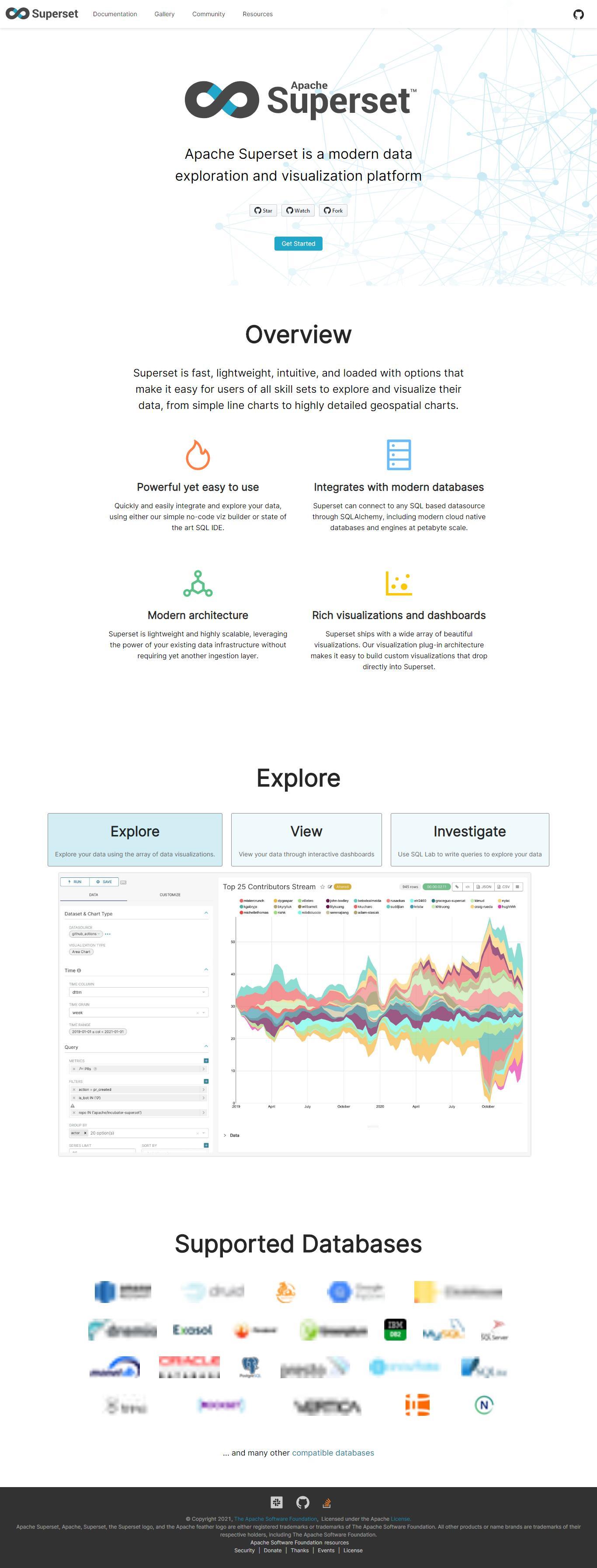 那什么是Superset呢?Superset是Airbnb(知名在线房屋短租公司)开源的资料探查与可视化平台(曾用名Panoramix、Caravel),该工具在可视化、易用性和互动性上非常有特色,用户可以轻松对资料进行可视化分析Superset 也是一款企业级商业智能 Web 应用程序,Superset已捐赠给Apache软件基金会,还处于范训阶段,Superset第一个版本为0.20,是基于python 2基础上构建,目前最新稳定版本为1.3.2,是基于python 3构建的,发行测验版本为1.4RC,Superset官网地址:https://superset.apache.org/如下图: