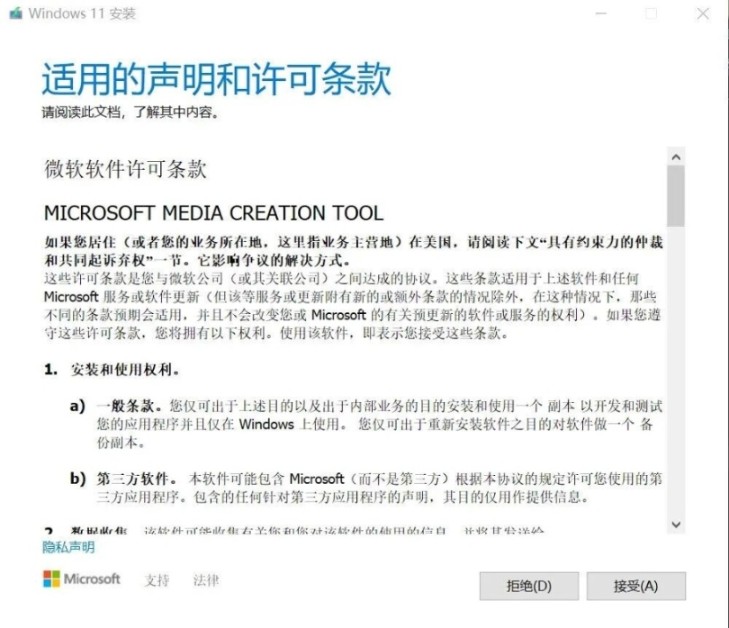 下载好是一个叫“MediaCreationToolW11”的应用程序,双击打开它,就是下面这个页面,直接点“接受”